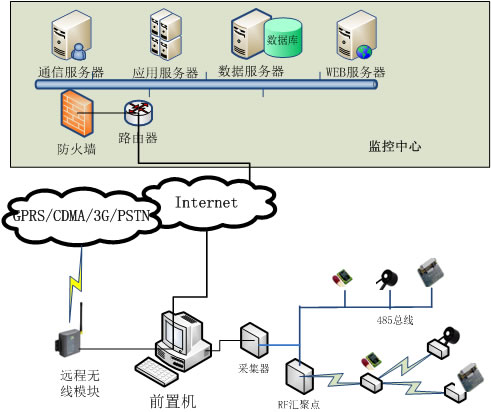 環(huán)境監(jiān)測(cè)報(bào)警系統(tǒng)通過(guò)采集現(xiàn)場(chǎng)傳感器數(shù)據(jù),并將數(shù)據(jù)通過(guò)有線、無(wú)線方式實(shí)時(shí)傳輸?shù)焦ぷ髡旧线M(jìn)行監(jiān)測(cè)、存儲(chǔ)與分析,輸出曲線與多類圖表,進(jìn)行統(tǒng)計(jì)分析和檔案記錄;系統(tǒng)提供手機(jī)、短信和郵件多種遠(yuǎn)程報(bào)警功能,供事后分析處理;可根據(jù)用戶應(yīng)用靈活配置各類環(huán)境因子傳感器;系統(tǒng)具有分級(jí)和角色權(quán)限管理功能,為不同用戶管理提供了一個(gè)多級(jí)配置管理的監(jiān)控平臺(tái),為現(xiàn)場(chǎng)管理和質(zhì)量控制提供強(qiáng)有力的技術(shù)保障。系統(tǒng)結(jié)構(gòu)如下圖: