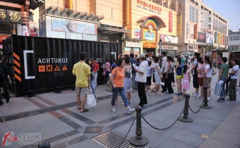 一周之后,這臺集裝箱突然現(xiàn)身在北京王府井步行街,箱體上的兩個(gè)觀察孔引來了過往游客的圍觀,甚至一度影響到步行街的交通——長長的隊(duì)伍幾乎橫穿了寬闊的王府井大街。