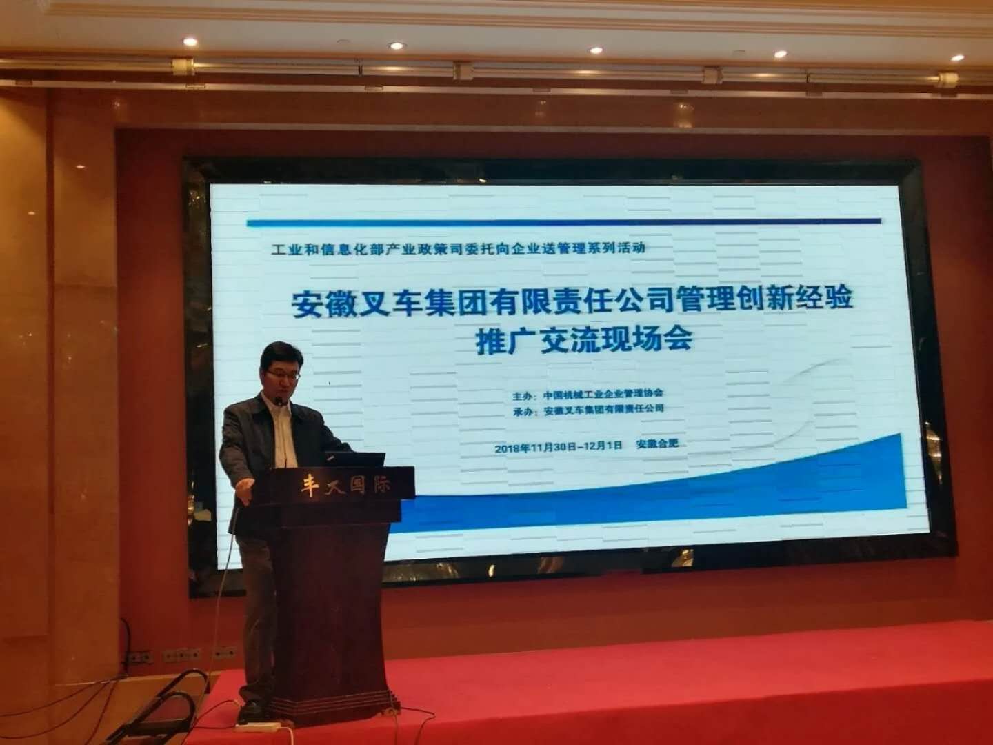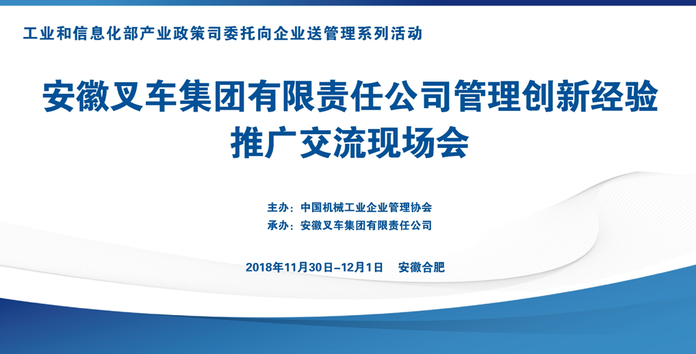 2018年11月29日-12月1日,工信部產(chǎn)業(yè)政策司委托中國機械工業(yè)企業(yè)管理協(xié)會(簡稱中機企協(xié))主辦、安徽叉車集團有限責任公司(簡稱合力)承辦的機械行業(yè)“向企業(yè)送管理”現(xiàn)場交流活動在安徽省合肥市隆重舉辦。工信部產(chǎn)業(yè)司產(chǎn)業(yè)組織處處長匡佩遠,趙薛憶,中機企協(xié)理事長孫伯淮,常務(wù)副理事長李玲,副理事長于中赤、張德進、張愛群,以及來自機械行業(yè)的企業(yè)代表180余人參加了活動。