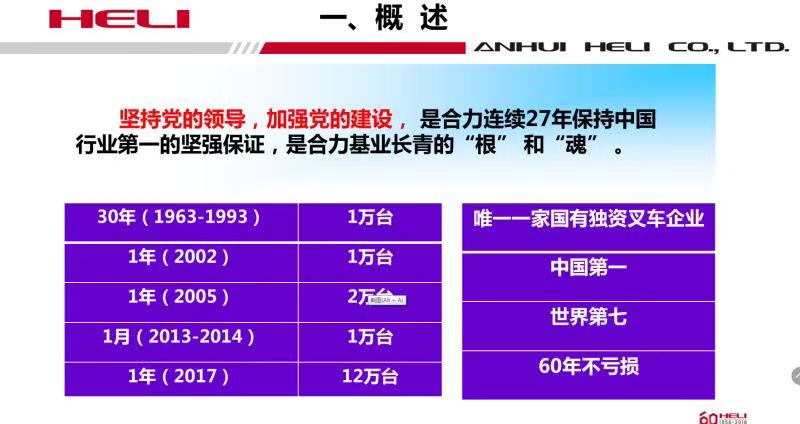 現(xiàn)場交流活動部分,合力系統(tǒng)地、多維度地向與會代表分享了集團發(fā)展的戰(zhàn)略思考和實踐做法。合力黨委書記、董事長張德進介紹了公司60年的發(fā)展歷程。合力是安徽省國資委獨資企業(yè),主營業(yè)務(wù)為工業(yè)車輛、工程機械及關(guān)鍵零部件的研發(fā)、制造與銷售,是我國規(guī)模最大,產(chǎn)業(yè)鏈條最完整,綜合實力與經(jīng)濟效益最好的工業(yè)車輛研發(fā)、制造和銷售基地。世界工程車輛協(xié)會主席單位。經(jīng)過60年的發(fā)展,合力產(chǎn)品目前在線生產(chǎn)的2000多種型號、500多類全部擁有自主知識產(chǎn)權(quán),產(chǎn)品綜合性能處于國內(nèi)領(lǐng)先、國際先進水平。主導(dǎo)產(chǎn)品通過歐盟、美國和ISO體系等相關(guān)認證。