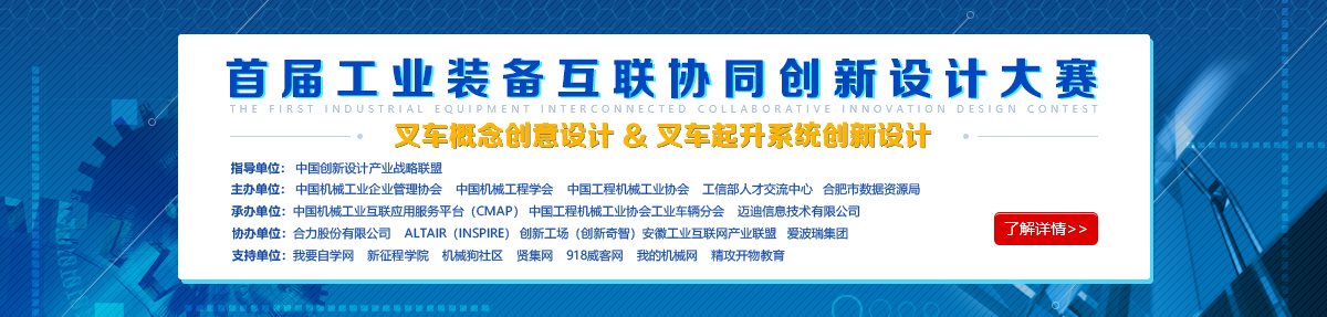 日前,由“中國創(chuàng)新設(shè)計產(chǎn)業(yè)戰(zhàn)略聯(lián)盟”指導(dǎo),中國機械工業(yè)企業(yè)管理協(xié)會、中國機械工程學(xué)會、中國工程機械工業(yè)協(xié)會、工業(yè)和信息化部人才交流中心、合肥市數(shù)據(jù)資源局主辦,中國機械工業(yè)互聯(lián)應(yīng)用服務(wù)平臺(CMAP),中國工程機械協(xié)會工業(yè)車輛分會、邁迪信息技術(shù)公司承辦,合力股份有限公司、澳汰爾工程軟件(上海)有限公司、深圳創(chuàng)新奇智科技有限公司、安徽工業(yè)互聯(lián)網(wǎng)產(chǎn)業(yè)聯(lián)盟、愛波瑞集團協(xié)辦,機械狗社區(qū)、精攻開物教育、我的機械網(wǎng)、我要自學(xué)網(wǎng)、賢集網(wǎng)、新征程學(xué)院、918威客網(wǎng)支持的“全國首屆工業(yè)裝備互聯(lián)協(xié)同創(chuàng)新設(shè)計大賽(叉車專題賽)”報名通道關(guān)閉。